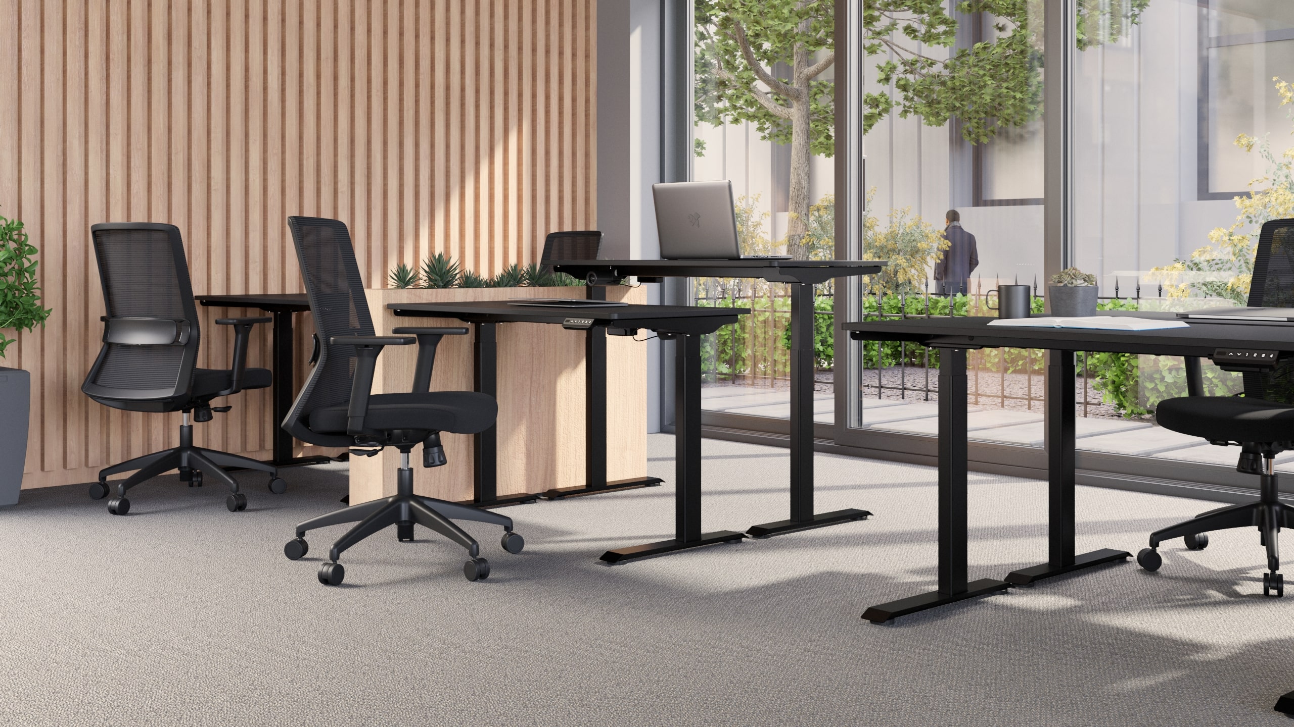 El escritorio regulable Up cuenta con una superficie en melamina de 18 mm de espesor, soportado por una estructura metálica en cold rolled con pintura electrostática semi mate. Incluye un sistema de elevación sensible y 4 preajustes de memoria programables, ofreciendo versatilidad en un diseño minimalista.
